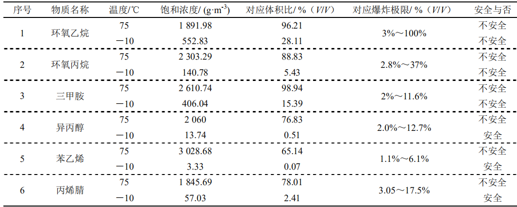 如表1所示,當(dāng)真空泵出口尾氣溫度為75℃時,每種有機物質(zhì)的飽和濃度理論上非常高。如果廢氣稀釋率不足,很容易引起安全事故。單套PL真空泵的環(huán)氧乙烷泄漏量約為120m3/h,三個真空泵的總流量為360 m3/h。事故發(fā)生時焚燒爐的實際處理風(fēng)量也不超過5000m3/h,2.4%的平均濃度在相應(yīng)的爆炸范圍內(nèi)。可見廢氣排放真空泵出口溫度過高,有機材料沸點低,導(dǎo)致有機廢氣濃度高。與此同時,相應(yīng)的稀釋倍數(shù)不夠,再加上環(huán)氧丙烷和環(huán)丙烷,氧乙烷化學(xué)性質(zhì),最終達到有機成分的相應(yīng)爆炸極限,造成爆炸事故。